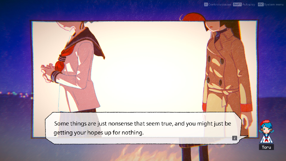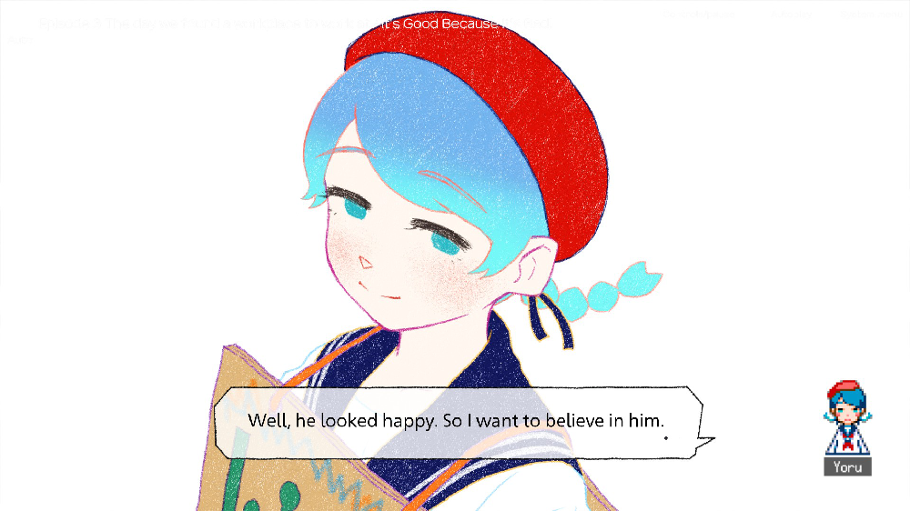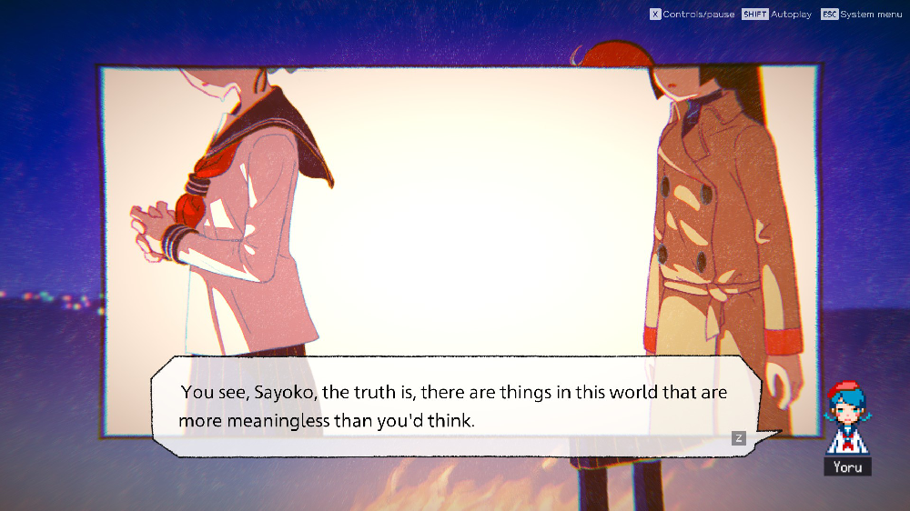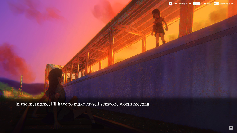 The characters are thankfully written quite bluntly and in Sayako’s monologues I can't help but choose to relate and dwell in the way they make me feel. “A Troublesome spectre that’s present and can never be interacted with” "Don't think of it as not being able to think. Think of it as not needing to think.” I’ve attached some screenshots too.